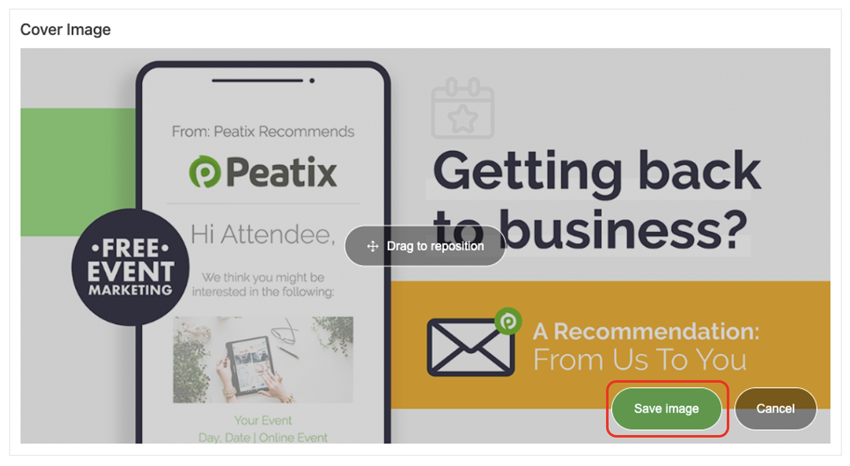The cover image of the event is shown on Peatix Search and in event recommendation emails. We recommend uploading an image that fits your event and encourages people to sign up.