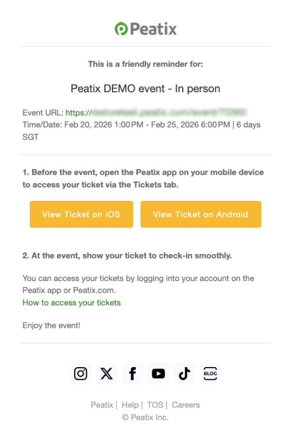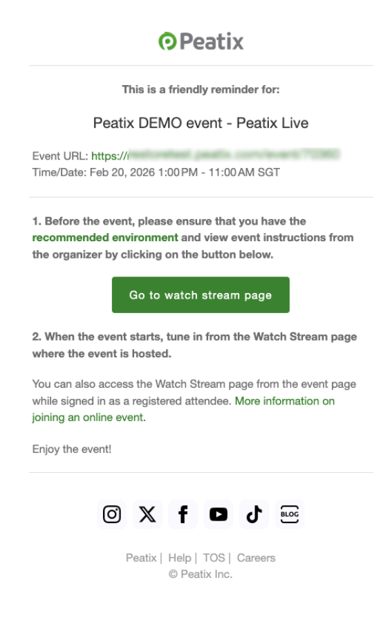 * For multiple-days event using a single event page, an event reminder email will be sent approximately 24 hours before the first event start time.