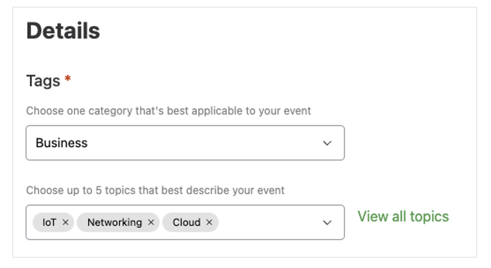 Next, select up to five topics that best describe your event. Topics are more specific recommendation tags that help attendees discover similar events they may become interested in.