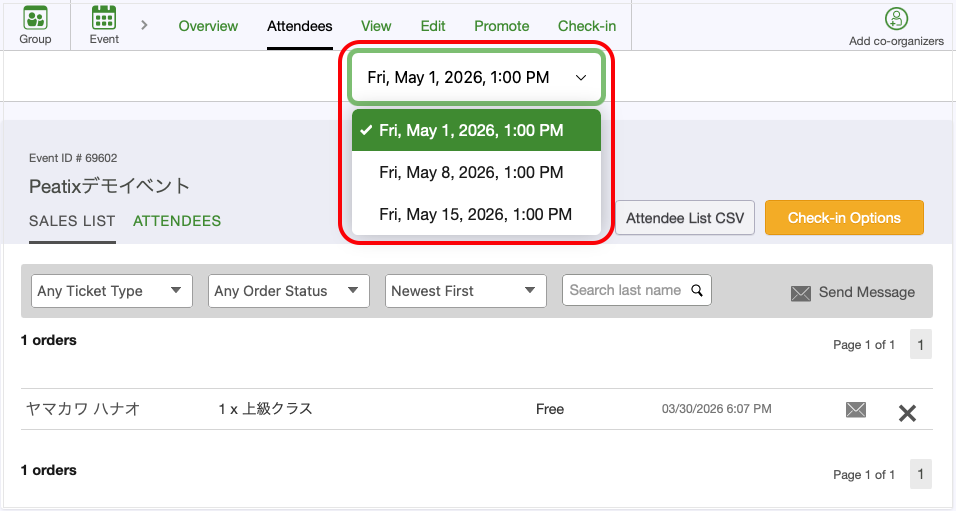 - Attendee information (e.g., name in kana, ticket count) is available per occurrence date. Not available for the whole event collectively.