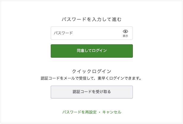 パスワードが分からない場合は、「認証コードを受け取る」をクリックすると、登録しているメールアドレスにログイン認証コードが送付されます。こちらを利用してログインしてください。