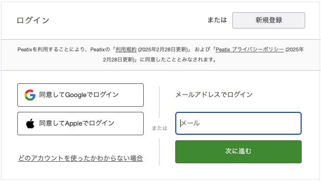 ※ピーティックスアプリを利用の場合は、「メール使う」を選択後、メールアドレスを入力したら「認証」をタップしてください。
