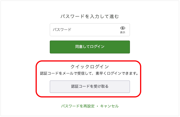 メールアドレスでログインする際にパスワードを忘れた場合、認証コードを取得することでログインできます。