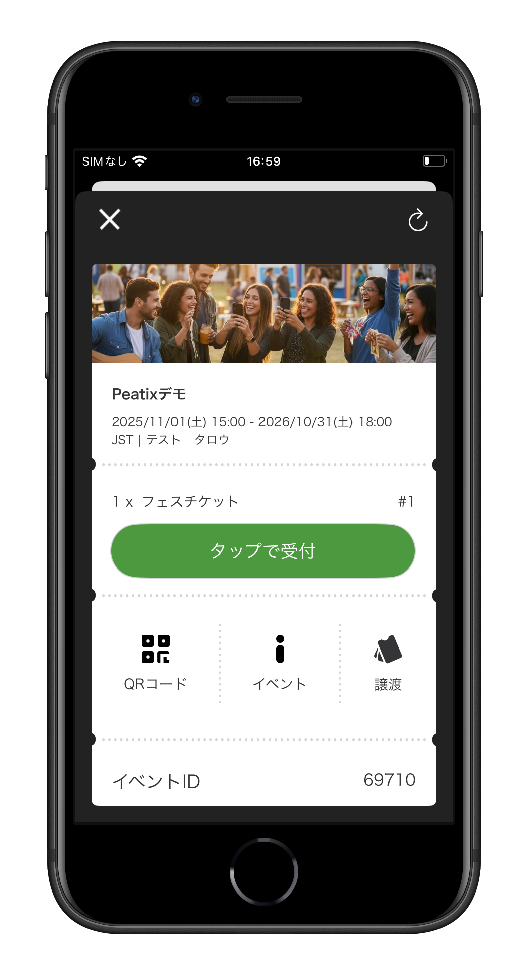 Peatixアプリの参加者のチケット画面において、「タップで受付」がメインの受付方法として表示されるようになりました。「QRコード」はサブのチェックイン方法として、引き続きチケット画面に表示されます。